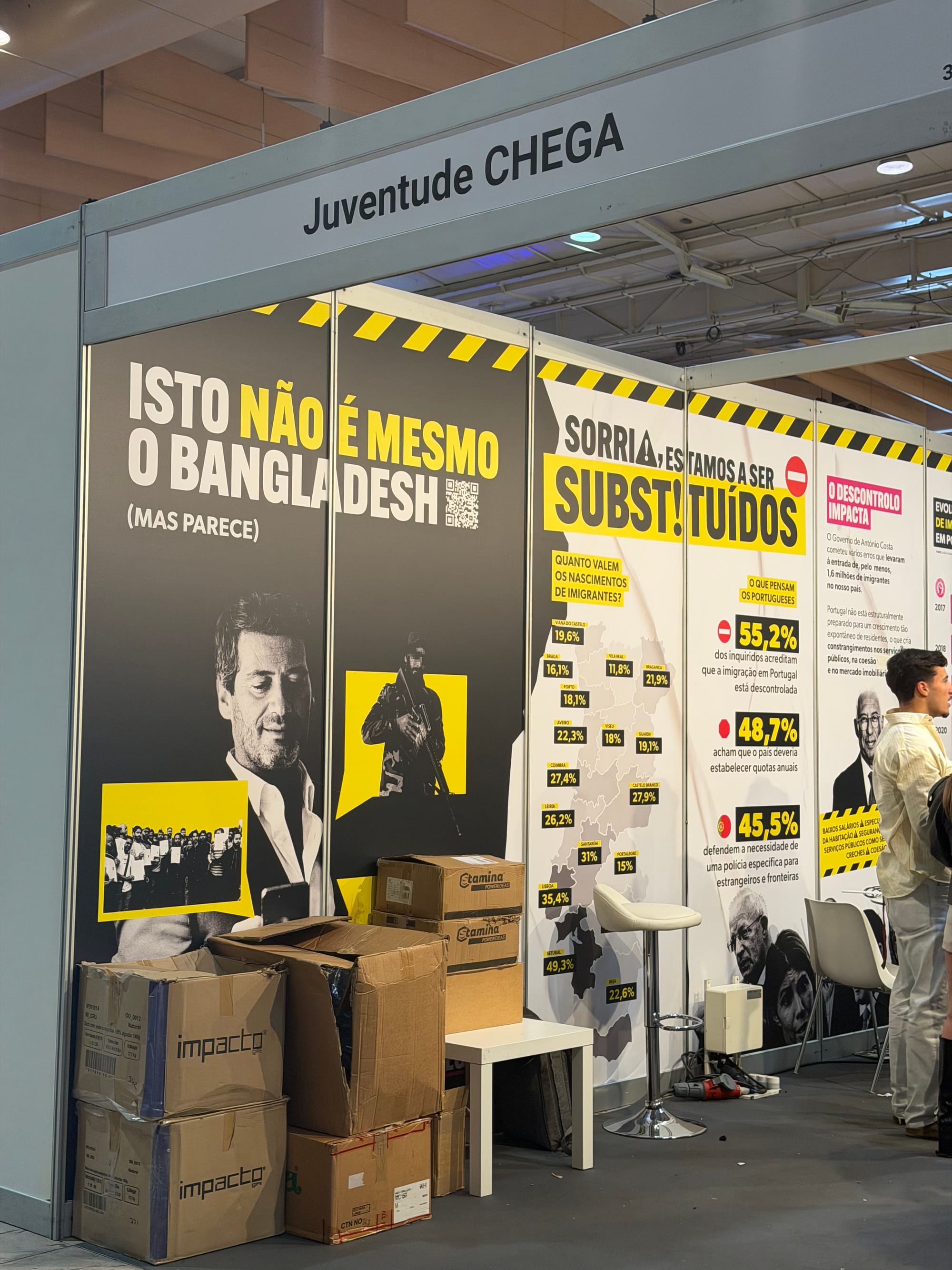 The messages and materials displayed at the stand [of CHEGA] — including posters with phrases like 'this is not Bangladesh', accompanied by graphs about immigration — promote an alarmist and stigmatizing narrative regarding migrant people. This type of discourse goes beyond the legitimate political debate of a political party about migration policies and approaches a rhetoric that associates entire groups of people with a social or cultural threat, that is, a racist rhetoric.